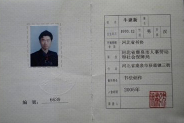 牛建新,1970年12月25日出生,河北省鹿泉市人。现为中国书法家协会会员,西柏坡紫砂书画艺术馆艺术总监,中华书法家协会名誉会长,中国茶商网书画顾问,中国楹联学会书法艺术委员会委员,河北省楹联学会书法艺术委员会副主任,河北省书法家协会评级委员,北京东方名家书画院签约书画家,国艺(9)号文件授予最具收藏潜力艺术家称号,鹿泉市文联副主席,鹿泉市青联副主席。